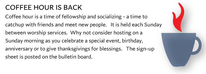 The Altar Guild is again reminding you that a good way to honor or memorialize a friend or loved one is to offer Sunday flowers in their name. Forms can be found in the back of the church and a donation is requested to accompany the form. At this time we are focusing only on flowers, as they are again displayed weekly on the altar.
